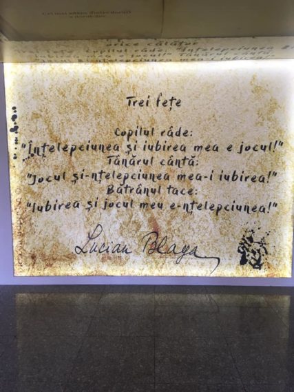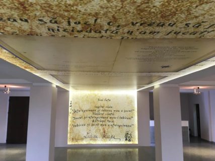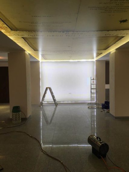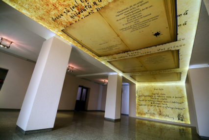 Pentru a mentine atmosfera interioara ca intr-o poveste echipa noastra a montat tavanele extensibile printate cu citatele poetului.
